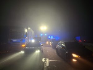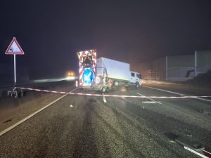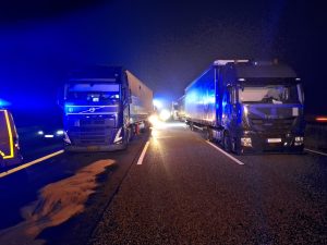 Ein Lkw-Fahrer übersah den Anfang einer Nachtbaustelle und schob dadurch einen dort geparkten Lkw vor sich her. Durch die Schadensgröße musste die A5 für mehrere Stunden voll gesperrt werden. Die erst eintreffenden Kräfte begannen umgehend mit der Patienten versorgen und unterstützten bei der Betreuung. Nachrückende Kräfte fingen auslaufende Betriebsstoffe auf und räumten Trümmer von der Fahrbahn.